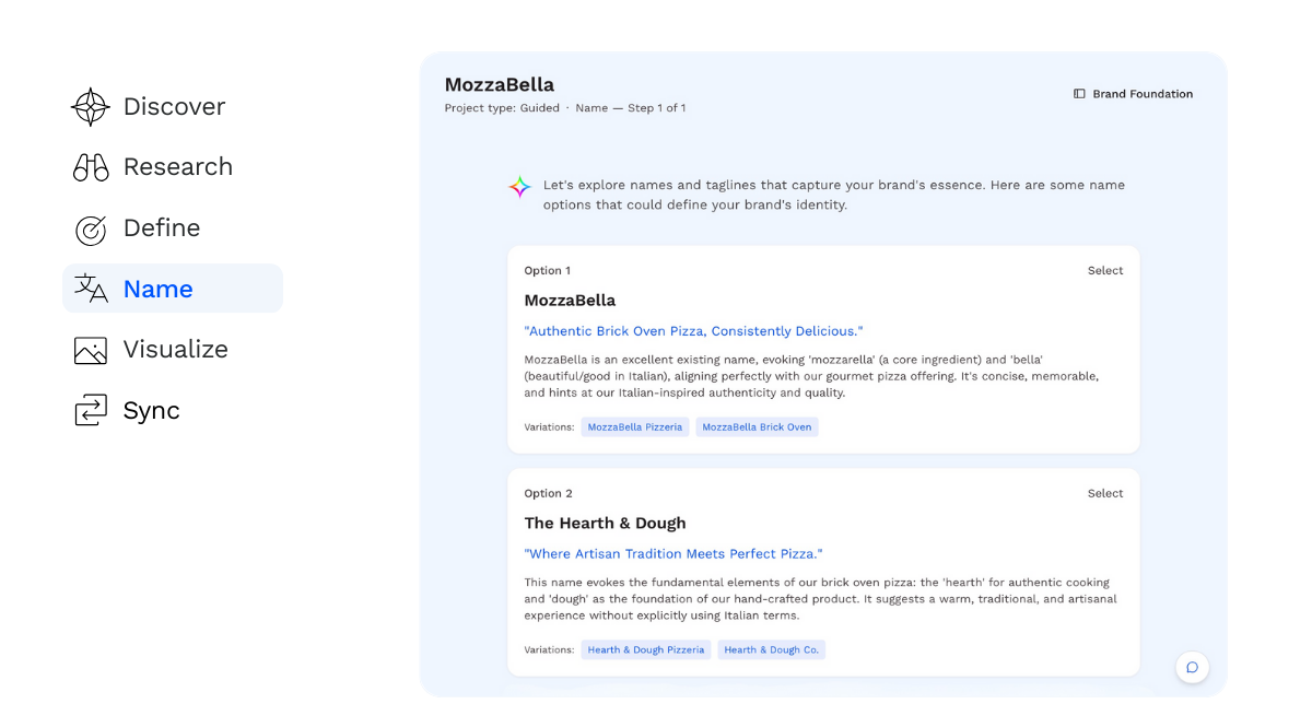 Explore naming ideas inspired by your brand’s purpose and personality.